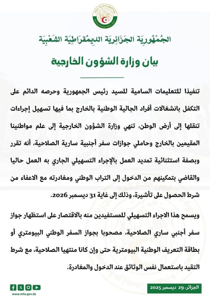 Le Consulat vous Informe qu’ à titre exceptionnel et dérogatoire, et ce jusqu’au 31 decembre 2026, les ressortissants algériens détenteurs de passeports étrangers en cours de validité peuvent rentrer et sortir du territoire national sans l’obligation d’obtenir au préalable un visa suivant une des deux (02) formules: