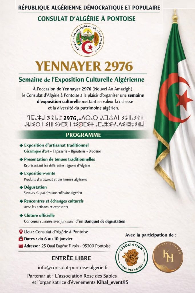 À l’occasion de Yennayer 2976 (Nouvel An Amazigh) le Consulat d’Algérie à Pontoise a le plaisir d’organiser une semaine d’exposition culturelle mettant en valeur la richesse et la diversité du patrimoine algérien.